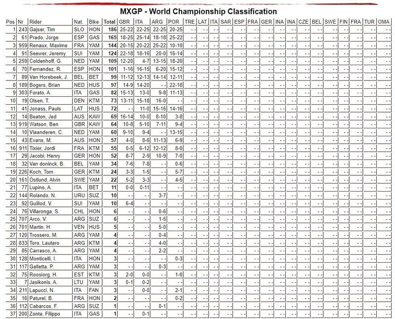 Nella classifica mondiale: Gajser 186, Prado 165, Renaux 144. Forato nono con 82 punti.