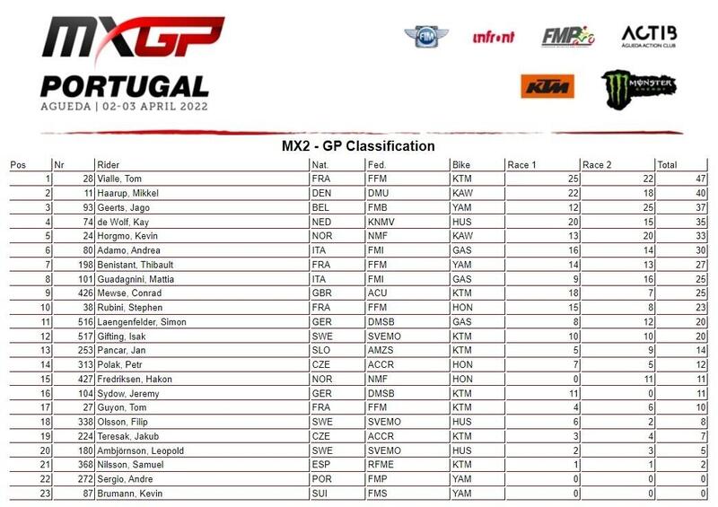 In MX2 il pilota Ktm ha bissato la vittoria argentina con il successo in Portogallo, riducendo ulteriormente lo svantaggio sul capoclassifica, il belga Jago Geerts. Per il francese Vialle primo posto in Gara 1 e secondo in Gara 2 mentre Geerts ha fatto nono e primo. Andrea Adamo è sesto di giornata e primo italiano.