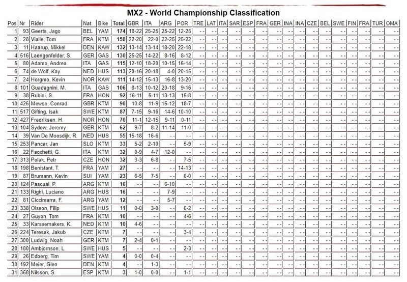 Nella classifica generale del mondiale: Geerts 174, Vialle 158, Haarup 132, Laengenfelder 130 e Adamo 115