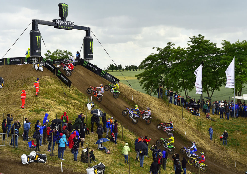 Di tutto ci si poteva aspettare dalla decima tappa iridata ma non un numero così elevato di colpi di scena. Dopo la frattura della caviglia di Max Nagl costretto a rinunciare dopo le qualifiche di sabato alla prova di casa, al ruolo di capoclassifica, e con buona probabilità anche al titolo iridato, anche il leader MX2 Jeffrey Herlings è stato messo a KO da una caduta nelle prime battute della prima manche 250 che gli ha procurato la frattura della clavicola destra. E come se non bastasse è stato costretto ad uscire di scena anche Alex Tonkov per via di un errore e conseguente caduta colpa della quale si è lussato e fratturato una spalla.