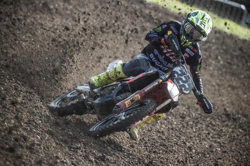 MXGP. Niente da fare sul circuito in prossimità di Winchester. Herlings va a vuoto nell’attacco al record di Cairoli, 6 vittorie a Matterley Basin, e quest’ultimo, presente per la seconda volta nel Mondiale di quest’anno, piazza una doppia top ten con la quale sancisce 2 concetti fondamentali: che la classe non è acqua e che il Aruba.it - Ducati Factory MX Team forse merita di più in quanto a materiale umano. Guadagnini è fuori per lo stiramento in allenamento, ma Seewer è due volte più lento del fuoriclasse nove volte Mondiale. C’è da pensare che la desmo450 MX valga molto di più di quanto dimostrino i Piloti “standard”. Beh, in ogni caso il Campionato continua a vertere sul duello tra Romain Febvre, Kawasaki, e Lucas Cooenen, il rookie che, promosso dalla MX2 alla classe regina, sta facendo faville nel Team KTM dei De Carli.