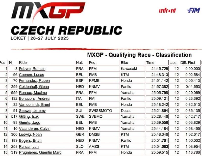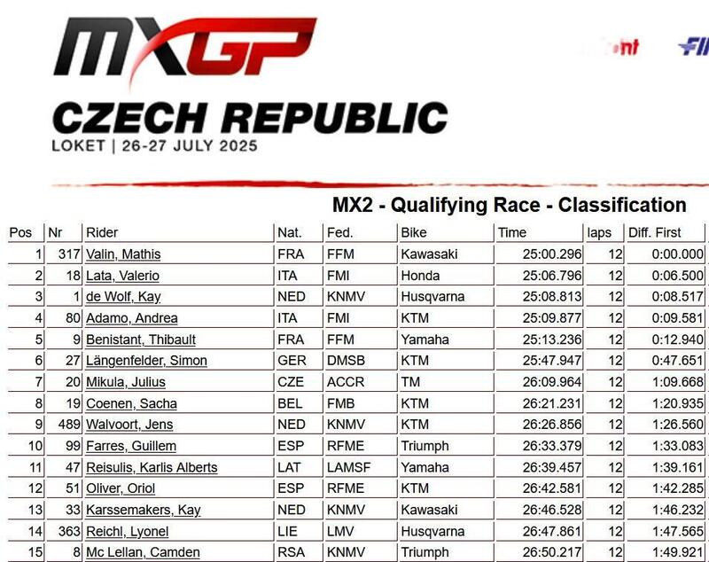 MX2Vince Mathis Valin. E questa è una (bella) sorpresa. Il francese fiduciato da Kawasaki meritava di veder premiata la sua velocità con un risultato concreto. Ma ancora più sorprendente, anche se non è una sorpresa, è il secondo posto di Valerio Lata, neo pupillo, giurerei, di Honda HRC per la classe cadetta. Terzo Kay de Wolf. Non è certo una sorpresa, bensì la conferma del ritorno alla massima competitività. Non è più tempo di mezze misure. Laengenfelder è in testa al Campionato, con un buon margine. Per chi insegue non basta più far bene, c’è bisogno di far punti togliendoli all’avversario. Cioè leggi: Andrea Adamo non può più accontentarsi. Destino da prendere in mano, il siciliano 2.0 deve far più punti di Laengenfelder e più punti di De Wolf. Dunque oggi ha Adamo ha vinto e perso. Quarto alle spalle di De Wolf, all’ultimo per la verità, ma due posizioni davanti al tedesco. Ci si può stare. Non di molto, ma Laengelfender è più vicino e De Wolf è regolato. Certo, domenica…. Qualifyng Race.