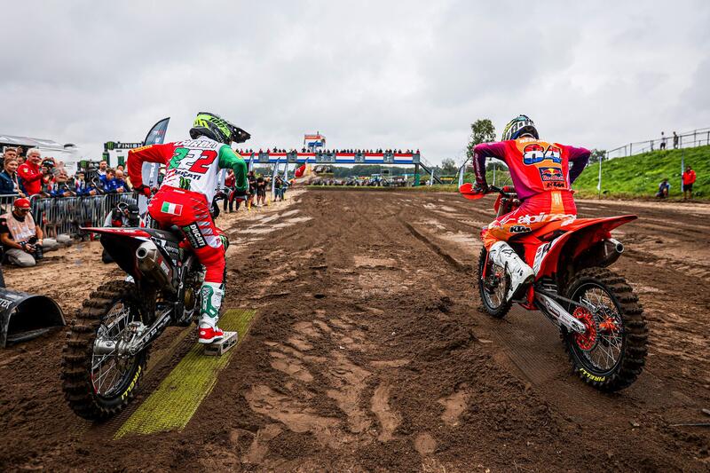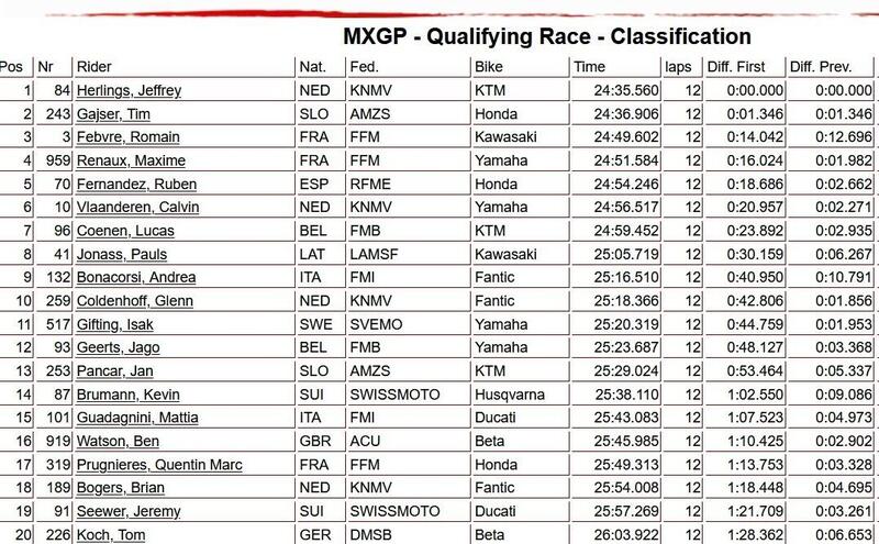 Intanto è Qualifying Race. E qualche elemento in più salta fuori. Jeffrey Herlings vince la Qualifying Race MX1 e, sotto il segno delle celebrazioni tra pluri Campioni del Mondo, i festeggiamenti sono faccenda quasi privata tra Herlings e Tim Gajser, primo e secondo. I bei tempi sono riproposti con rigore assoluto. Poi c’è l’altra gara, quella che corre verso l’assegnazione del Titolo. Romain Febvre è terzo, Lucas Coenen sesto, entrambi hanno guadagnato una posizione rispetto alla partenza, ma non sono mai stati in grado di impensierire la danza di testa, Herlings e Gajser primo e secondo dall’inizio alla fine. Febvre fa un altro passo avanti sul “Camino al Mundial”, il suo vantaggio sale a 30 punti, praticamente il valore di mezzo punteggio pieno di GP.