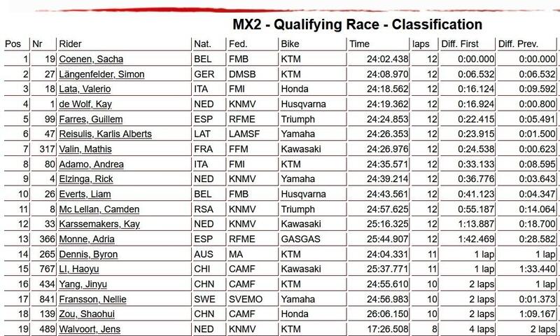 MX2. Sui 12 giri della Qualifyng Race della serie “minore” saltano fuori un paio di osservazioni interessanti e una… un po’ meno. Vince Sacha Coenen, e Simon Laengenfelder è secondo. Le osservazioni. Il “picolo” Coenen va sempre più forte ed è sempre più consapevole, Laengenfelder “tiene” alla pressione e, anzi, riesce a spingere più forte. Altra osservazione, la doppietta KTM “Italia” in questo ordine dice che i Piloti sono “liberi”: vinca il migliore. Kay de Wolf quarto, conferma la tendenza dell’ultimo periodo. Parte sesto ed è protagonista di un bellissimo inseguimento… incompleto. Recupera costantemente e risale, ma non riesce, per meno di un secondo, a superare il “muro” di un eccellente Valerio Lata. Sacha, Simon, Valerio, nell’ordine, Kay quarto. Purtroppo Andrea Adamo non è in partita. Parte male e si inabissa al decimo posto. Ne recupera un paio, ma tutto questo non basta più.