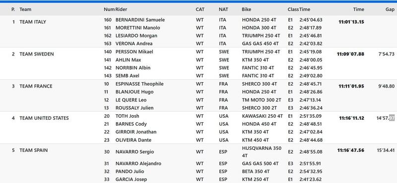 Assoluta. Nuova tappa del duello Garcia-Verona. Se ormai possiamo sbirciare oltre il sipario sul risultato delle Squadre, altrettanto “visivamente” bisogna riconoscere la straordinaria, ennesima performance dello Spagnolo di KTM e di Farioli che, con cinque giornate vittoriose su sei si avvia a vincere la quinta assoluta consecutiva alla 6 Giorni. Pilota straordinario! La 6Days Italy ha confermato altresì che Garcia ha un solo avversario, l’alter ego in rosso Andrea Verona, sempre vicinissimo e pur vincitore della quarta giornata di gara. Due speciali vincenti per ciascuno dei due duellanti, ma è Garcia che si aggiudica l’ultimo rush di Enduro prima del Motocross finale. C’è una grossa differenza tra le “conseguenze” del duello: Garcia ha corso praticamente con l’unico obiettivo di confermarsi nell’individuale, Verona ha trascinato la sua Squadra alla conquista del Trofeo delle Nazioni! Belle, emozionanti entrambe le “motivazioni”. Terzo per la terza volta, ma troppo all’ombra degli implacabili battistrada, lo svedese Mikael Persson, e ancora il fortissimo Junior australiano Kyron Bacon, quarto davanti a un monumentale Samuele Bernardini.