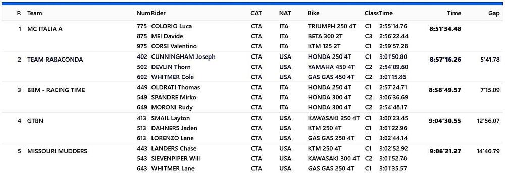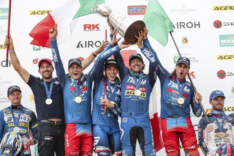 Complimenti ai Vincitori. Tanto di cappello. Andrea Verona, GasGas, Samuele Bernardini, Honda, Morgan Lesiardo, Triumph, e Manolo Morettini, Honda, hanno conquistato il Trofeo Mondiale, quasi nove minuti agli svedesi e quasi 12 ai francesi. Kevin Cristino, Fantic, Alberto Elgari, TM, e Manuel Verzeroli, TM, si sono aggiudicati il Trofeo Junior, ex Vaso d’Argento. Un minuto e mezzo ai francesi e tre abbondanti agli australiani. Il MC Italia A, infine, Luca Colorio, Triumph, Davide Mei, Beta, e Valentino Corsi, KTM, ha vinto il Club Award. Gli americani del Rabaconda secondi, BBM Racing Time (Oldrati, Spandre, Moroni) terzi. Complimenti alle ragazze anche se non ce l’hanno fatta, Francesca Nocera, Honda, Sara Traini, Rieju e Asia Volpi, Beta, quarte.