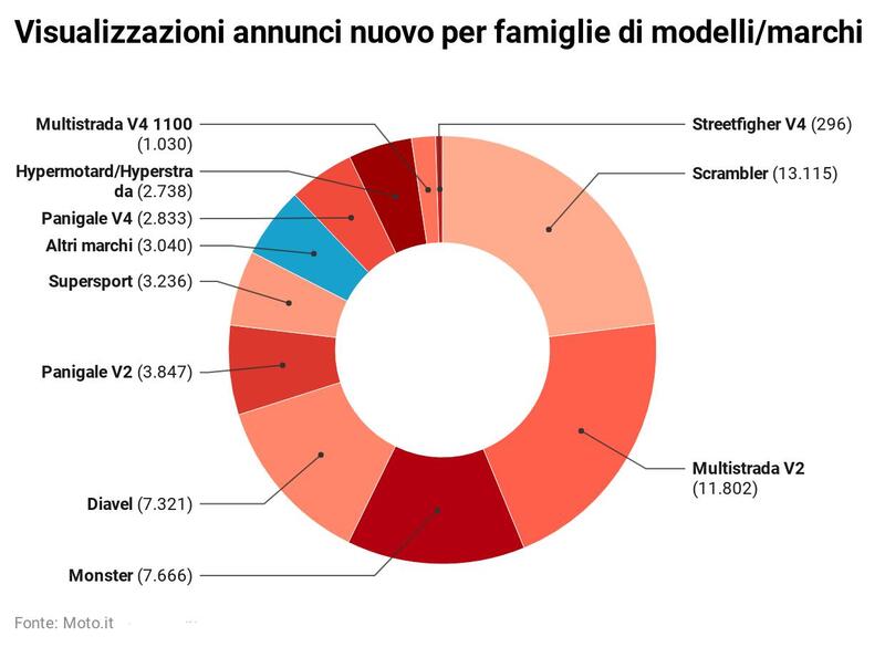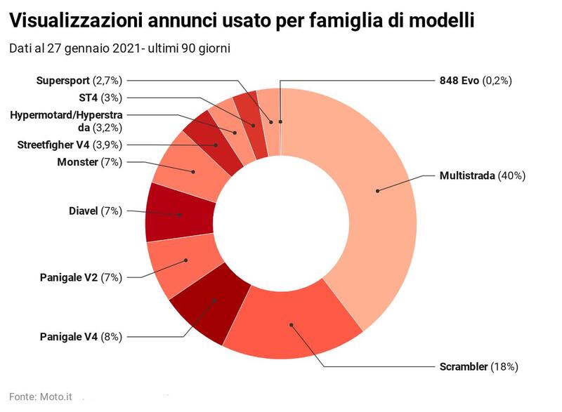 Sul lato usato, invece, torna prepotentemente a farsi la vedere la Panigale V4 tra i modelli più cercati tra le inserzioni, cui non corrisponde un altrettanto elevato volume di vendita (ricordiamo che stiamo sempre analizzando i dati riferiti agli ultimi tre mesi del 2020): è possibile che un modello così passionale, tecnologico e desiderato sia scarsamente offerto nel mercato dell'usato (insomma: chi lo ha se lo tiene ben stretto) o che sia un oggetto dei sogni ma poi, spesso, il motociclista sia portato a comprare moto più eclettiche (ma non per questo meno emozionanti) e come la Multistrada.