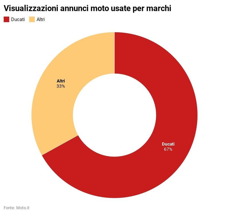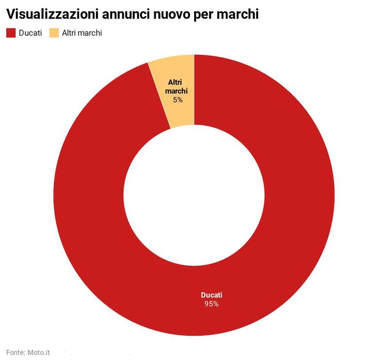 Tale rapporto percentuale sulle ricerche degli utenti di Moto.it diventa poi, prevedibilmente, ancora più schiacciante in favore delle moto di Borgo Panigale (95% contro 5%) quando andiamo a considerare le inserzioni che riguardano le moto nuove.