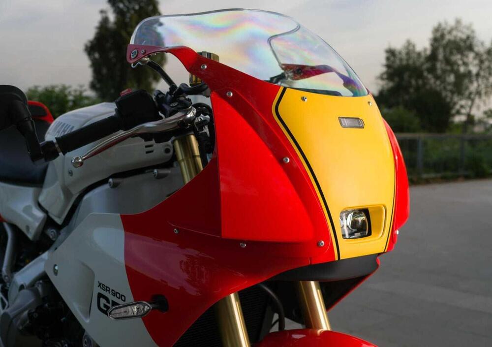 Notiamo infatti la semicarenatura aerodinamica un po' spigolosa e il codone con portanumero. Non si tratta però soltanto di un aggiornamento estetico della faster son XSR900. La posizione di guida è diversa rispetto e ovviamente più caricata sull'avantreno anche se non estrema. Troviamo semimanubri clip-on e pedane in alluminio regolabili su due posizioni. Il telaio Deltabox è stato rivisto e irrigidito in particolare l'albero di sterzo in alluminio ha consentito di regolarne la rigidità. Non è verniciato di nero come sulla XSR900 ma in argento proprio come le moto da competizione di Rainey. Certo sulla sua 500 da gran premio non c'era l'IMU a sei assi di derivazione R1 e i controlli elettronici del sistema YRC con tre modalità di guida e l'ampia possibilità di personalizzazione. La forcella Upside-Down di KYB è completamente regolabile mentre il monoammortizzatore posteriore è regolabile nel precarico tramite pomello. I cerchi Spin Forged montano pneumatici sportivi Bridgestone Battlax Hypersport S23 nelle misure 120/70 e 180/55. Troviamo poi pompa ad attacco radiale Brembo, dischi da 298 e 245 mm. Il peso aumenta di 7kg e arriva a 200 tondi tondi in ordine di marcia. Aumenta seppur di poco anche l'interasse passando a 1500 mm e l'altezza della sella da 810 a 835 mm. Il motore rimane il CP3 Euro5+ da 119 cv a 10.000 giri e 93 Nm a 7000 giri ma il cambio è dotato di Quickshifter di terza generazione e frizione antisaltellamento. La vedremo ad EICMA e sarà disponibile a presso la rete Yamaha a partire dal mese di aprile 2024. Il prezzo non è ancora stato comunicato mentre le colorazioni sono due: Legend Red e Power Grey.