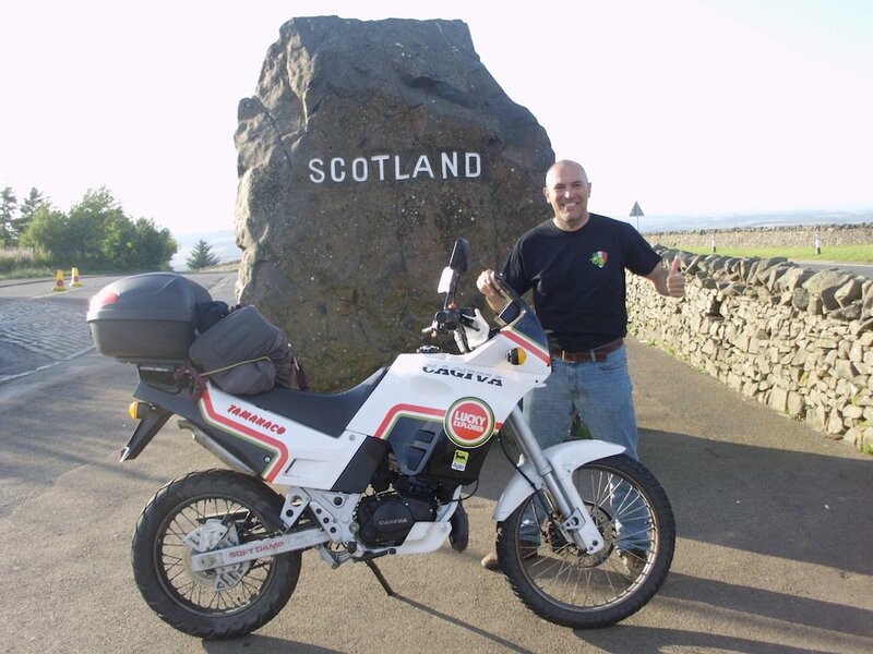 Il Delfaccio. Nel 125 Club Italia ormai lo chiamiamo così. Leggendo il racconto del nostro mitico Massimo Sebastiano Barbagallo in arte “Delfo74”, forse rimarrete colpiti dal fatto che un viaggio che farebbe comunque impressione anche se fatto a bordo di una diffusa BMW GS… sia stato intrapreso a bordo di una Cagiva Tamanaco 125 del 1988 e senza alcun abbigliamento particolare o alcuna dotazione tecnica specifica. Si… perché Delfo per scelta possiede un telefono anni 90 ed un abbigliamento volutamente non motociclistico che mi fa sempre tornare in mente la descrizione che Paolo Villaggio nel film Fantozzi dava al completo da tennis che il ragioniere indossava nella partita contro Filini. Volendo parafrasarlo: “Barbagallo: maglietta della salute, jeans da passeggio, scarpa penosamente normale, casco da scooter made in china preso al discount, giaccone da moto modello stagione 1912”. Ecco, questo è Delfo. Colui che si lancia in un viaggio che per assenza di preparazione e precarietà delle condizioni del mezzo farebbe paura ai più coraggiosi. Ma lui è così e come lo descrive il nostro Socio Mauro Arrigoni di Pavia, che lo ha sempre aiutato per tutto il viaggio fornendogli validi consigli su come cercare di tenere insieme la Tamanaco: “Se Delfo avesse voluto fare un viaggio “in pantofole” avrebbe potuto appoggiare le chiappe su una BMW o una enduro di ultima generazione, ovviamente 4 Tempi, e partire senza il minimo dubbio, aggiungiamoci che poteva agganciare al manubrio un navigatore GPS e infilarsi in tasca uno smart phone e il gioco sarebbe stato fatto, avrebbe fatto un normalissimo viaggio di cui nessuno avrebbe parlato. Ma Delfo, invece, ha inforcato una Cagiva Tamanaco 125 2Tempi del 1988, si e’ stampato su qualche foglio qualche indicazione sulle strade ed un paio di cartine, ha messo in tasca un telefono poco piu’ avanzato dello swatch anni “90, macchina fotografica digitale e poi e’ partito all’avventura!!! Italia, Francia, Inghilterra, Scozia, quasi Svizzera e Germania: Delfo e’ stato inarrestabile, solo due inconvenienti “importanti” lo hanno rallentato, il surriscaldamento del motore e la valvola di scarico rotta ma che per fortuna non ha compromesso irreparabilmente il pistone. Un paio di incidenti, una coppia di pastiglie freno andate e gli occhiali donati involontariamente ad uno sconosciuto… Ma e’ tornato a casa con la sua Tamanaco! Quello che mi ha colpito nel corso delle nostre chiacchierate telefoniche, e’ stato lo spirito sempre positivo nonostante le difficolta/inconvenienti meccanici e la conoscenza delle lingue ovunque si trovasse. Quello che mi ha invece scioccato e’ la rapidita’ di spostamento del Delfaccio: un giorno mi ha chiamato dal mezzo della Francia alle 18, alle 8:30 del giorno dopo mi ha richiamato da Aosta!!!! Qualche giorno prima stessa cosa piu’ o meno…mi chiama da Londra… il tempo di cenare e farmi una dormita e lui era in Francia!!”.