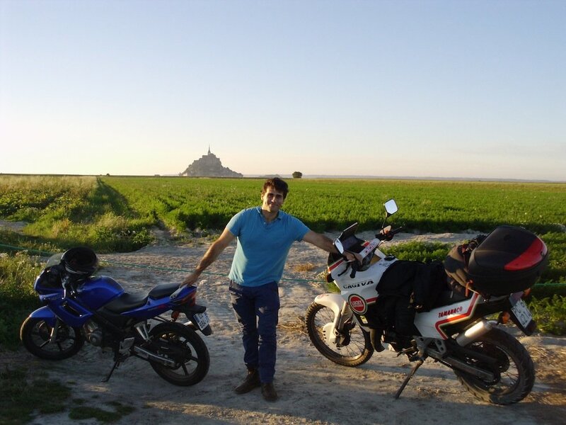 Strabiliato da quella visione quasi inquietante, ho scattato letteralmente una foto ogni 100 metri mentre mi avvicinavo al maestoso castello situato su un’isola separata dalla terraferma da un viottolo periodicamente sommerso dall’alta marea. Chiaramente il mio obiettivo era quello di avvinarmi il più possibile con la mia Tamanaco in modo da scattare una foto di quelle da incorniciare. Purtroppo, però, a un certo punto vengo fermato dalla Gendarmerie (la Francia è in stato di massima all’erta (“état d’urgence”) a causa del recente attentato di Nizza e scoprirò poco dopo, a mie spese, che il Mont-Saint-Michel è probabilmente il monumento più sorvegliato di Francia, beneficiando addirittura di un’apposita caserma della Gendarmerie situata proprio accanto al castello): ai mezzi a motore è vietato avvicinarsi all’isola e occorre parcheggiare l’auto o la moto a due chilometri dal castello prendendo poi la navetta che conduce nei pressi dell’isola. Deluso, mi guardo intorno per cercare di aggirare il divieto e vengo raggiunto, sul bordo di un esteso campo antistante il Mont-Saint-Michel, da un giovane motociclista parigino, anch’egli munito di moto 125 e ugualmente contrariato dal divieto di passare oltre con la propria moto. Confabuliamo brevemente e decidiamo di passare subito all’azione: si va per campi e al diavolo la Gendarmerie! Tra il dire e il fare c’è però di mezzo il mare, e addentrandoci nel campo notiamo che il terreno si fa sempre più pesante e gli sbarramenti (con ogni probabilità, a “difesa” del castello) sempre più impervi. Finiamo entrambi per terra (tra l’altro, il giovane parigino dispone di una 125 stradale!) e, mentre lui si rialza quasi subito, io, a causa dell’età non più tenerissima, mi ammacco per bene e ho bisogno del suo aiuto per rimettermi in piedi. Decidiamo comunque di proseguire (anche perché ci eravamo ormai spinti talmente addentro che tornare indietro ci sembrava irragionevole) e, superata l’ultima siepe (il Castello era ormai a un tiro di schioppo e stavamo quasi per estrarre le nostre fotocamere per la foto del secolo), troviamo appostata pazientemente ad attenderci una camionetta della Gendarmerie. Quasi certamente, come realizziamo poco dopo, i gendarmi si erano goduti tutta la scena (cadute comprese) dalla loro caserma (che da lontano ci sembrava una dépendance del Castello) e sono venuti ad aspettarci con calma all’uscita del campo… Veniamo minuziosamente perquisiti (noi e i nostri bagagli) e pesantemente redarguiti, ma fortunatamente non ci viene applicata alcuna sanzione (io, come al solito, faccio finta di non comprendere la lingua – il che quasi sempre funziona, in questi casi – e ai gendarmi evidentemente interessava più che altro accertarsi che non fossimo terroristi o gente in cerca di guai). Morale della favola, la “foto della vita” non siamo riusciti a scattarla, e siamo stati costretti a fare marcia indietro fino al parcheggio e a ritornare poi a bordo della navetta come dei “comuni turisti”…