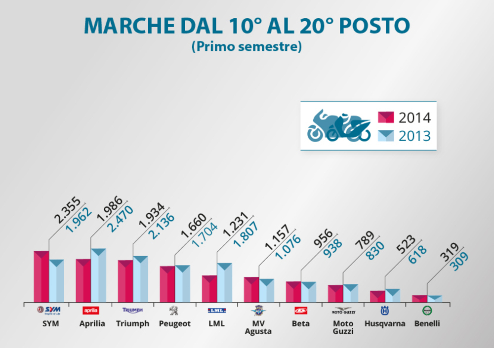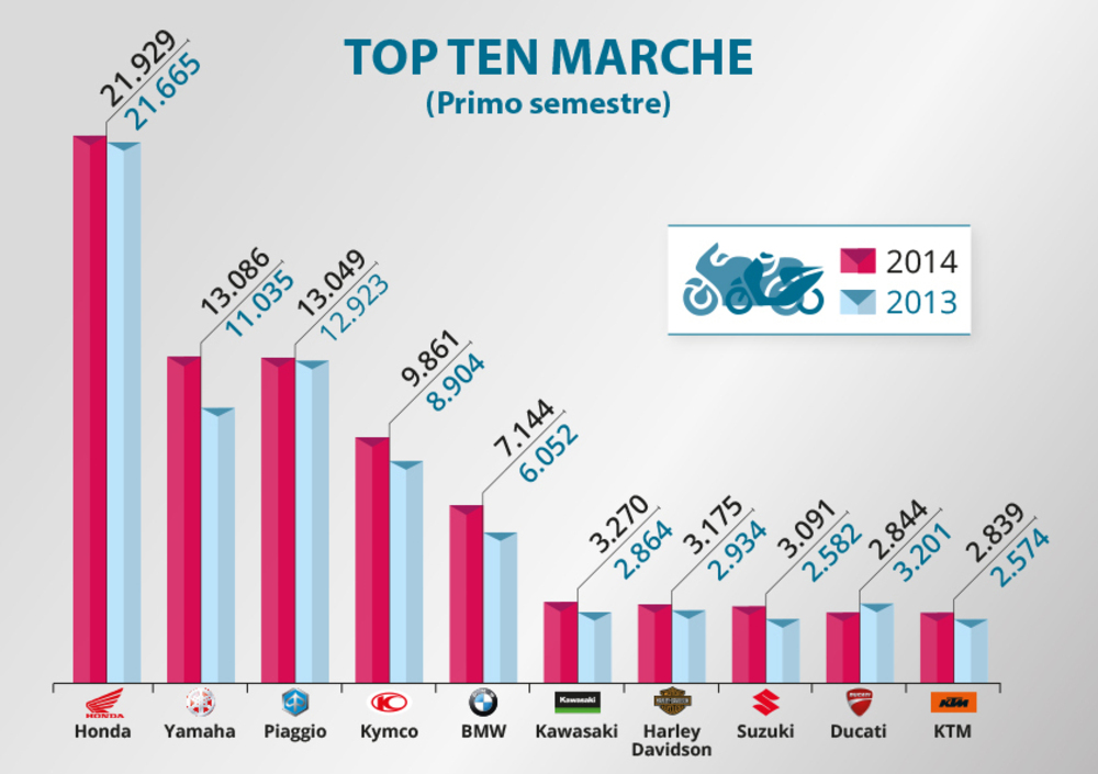 Nella graduatoria che riguarda le moto più vendute si nota che soltanto otto delle prime 15 marche hanno migliorato le immatricolazioni rispetto ai primi sei mesi del 2013. Quelle che hanno incrementato maggiormente il proprio giro d'affari, il dato medio delle moto vale un +7,3%, vedono al primo posto Yamaha che ha avuto un'impennata pari a +84%, grazie soprattutto alle nuove MT-09 e MT-07, seguita da Suzuki (+62% grazie alla V-Strom 1000 che è una novità) e BMW (+22%). Yamaha è così passata dalla settima posizione del 2013 alla terza attuale. Suzuki ha guadagnato solo una posizione, ma ha recuperato molto in termini di volumi.