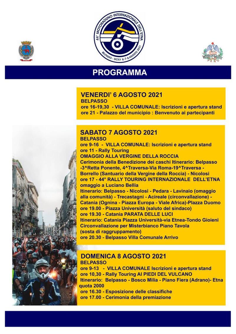 " Il Motoraduno avrà ancora la sua sfilata del sabato e assieme a mio fratello Nino alle ore diciassette di tutti i sabati della prima settima di agosto faremo suonare forte le sirene della partenza". Con queste parole Maria Grazia Bellia ci aveva lasciato l'anno scorso dopo la scomparsa del padre, il Prof. Luciano Bellia, che dal 1977 - ininterrottamente - aveva dato vita al Motoraduno Internazionale dell'Etna, per molti anni uno dei raduni più importanti del panorama mototuristico europeo; Maria Grazia è nel frattempo diventata presidente del nuovo Moto Club Luciano Bellia e, insieme al fratello, ha mantenuto l'impegno e la nuova edizione del Motoraduno è qui a attenderci: dal 6 all'8 agosto sempre a Belpasso, alle pendici dell'Etna. Sarà l'edizione numero 44, e si svolgerà con il programma originariamente previsto per il 2020 ma messo in stand-by dalla pandemia.
