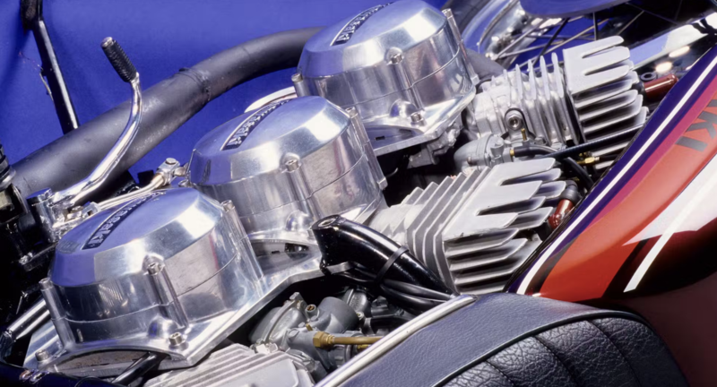 Un'altra sfida, ben lontana dal design "semplice" di un tricilindrico, era la disposizione dei nove carburatori Mikuni (da 28 mm ciascuno). Lo spazio davanti alla ruota posteriore era insufficiente per i tre più arretrati, così l'ingegnoso ingegnere britannico ha ruotato il cilindro posteriore di 180 gradi. Questo ha permesso di stipare sei carburatori tra le due bancate posteriori, con tre collettori di scarico che fuoriescono dal retro, creando una soluzione tanto complessa quanto affascinante.