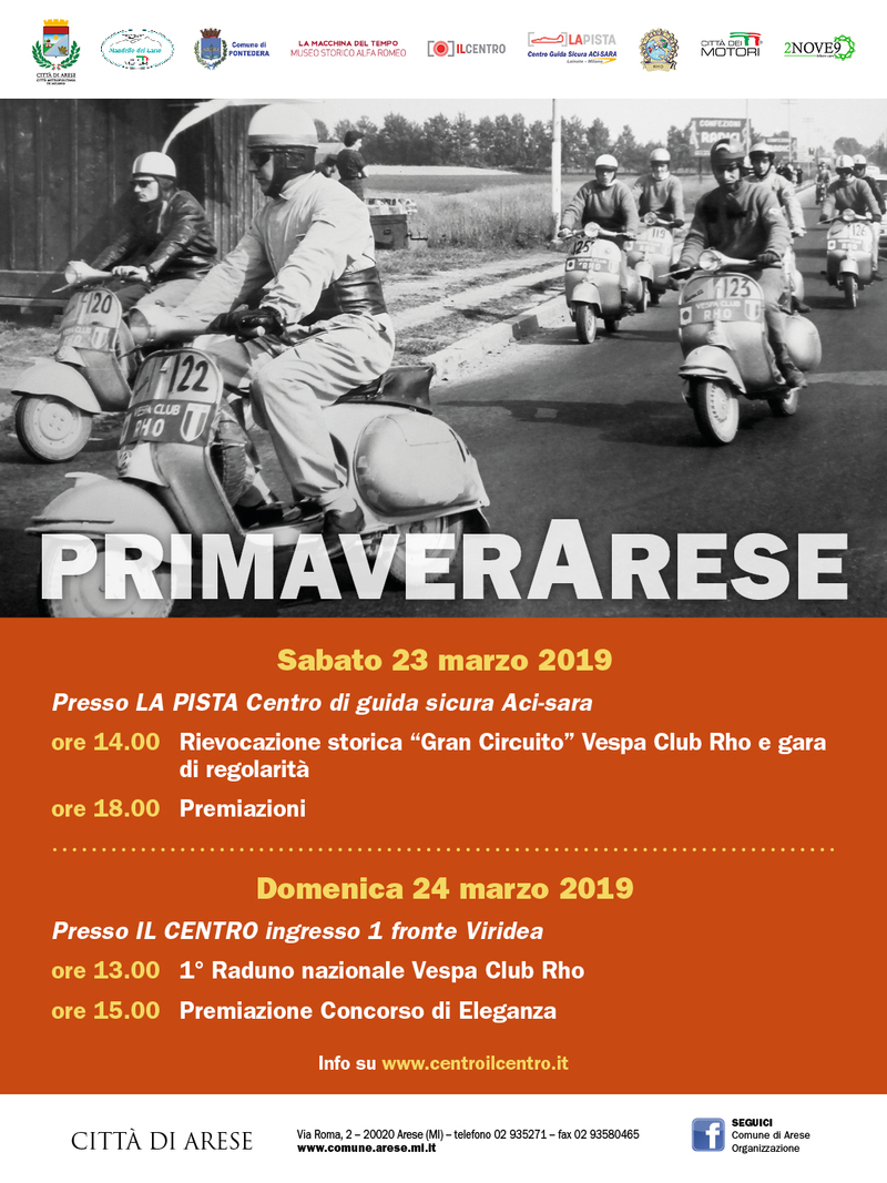 "PrimaverArese", iniziativa organizzata dal Comune lombardo - in collaborazione con La Pista di Aci Vallelunga, l’Associazione Città dei Motori, il Museo Storico Alfa Romeo, la no-profit 2Nove92, il Vespa Club di Rho e i Comuni di Mandello del Lario e Pontedera, propone due imperdibili appuntamenti dedicati a tutti gli appassionati delle mitiche Vespe.