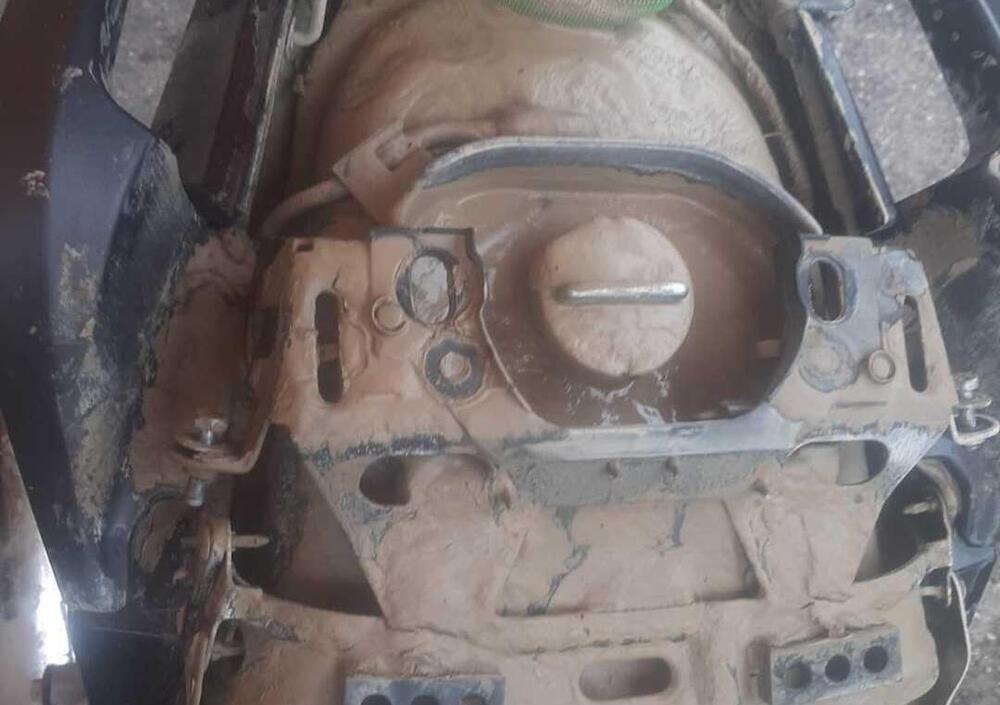 La trafila del recupero è lunga: smontaggio della sella e della batteria per un primo lavaggio, rimozione di tutte le parti di plastica per procedere con una pulizia minuziosa a caccia di ogni rimasuglio di terra. Questa prima operazione richiede dalle sei alle otto ore di tempo, poi una bella asciugata all’aria aperta e quindi via con appositi spray lubrificanti.