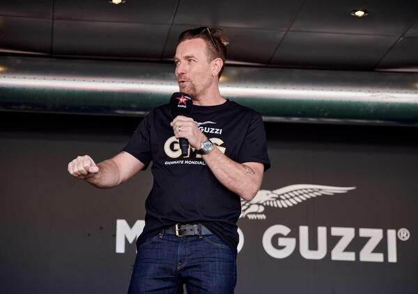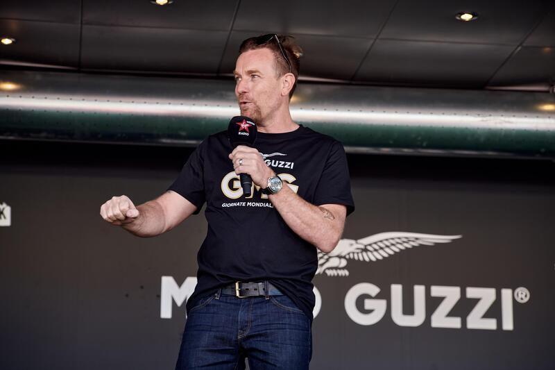 Non poteva mancare Ewan McGregor a Mandello del Lario. L'attore scozzese, grande appassionato dell'Aquila ha partecipato alle Giornate Mondiali Moto Guzzi e ha anche preso parte alla grande parata per celebrare il primo secolo di storia di Moto Guzzi. Per l'occasione è salito in sella alla nuova V100 e si è poi fermato per visitare il museo e le linee produttive della fabbrica.