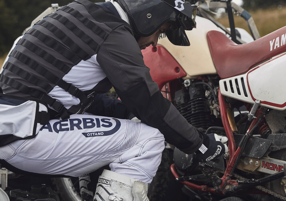 Ritroviamo quindi nei capi la robustezza dei tessuti dedicati all’enduro (Cordura e cotone) con alcuni dettagli presi dal mondo militare (vedi le tasche, le cerniere e numerosi accessori). Non manca la plastica tanto cara al signor Franco; la ritroviamo nella targhetta Acerbis rimovibile grazie al velcro. È una scelta chiara, improntata alla sobrietà che troviamo anche nella gamma dei colori, che sceglie tinte decise ma non vistose come quelle del mondo delle competizioni.