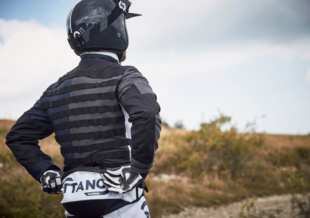 La definizione che più ci piace è Off and Road. Ottano si rivolge infatti al mondo delle enduro stradali, delle scrambler e in genere delle due ruote a manubrio alto usate sia nel fuoristrada leggero che in città. Per il fuoristrada racing esiste ovviamente la linea dedicata di Acerbis. Ottano fa un altro mestiere: non strizza l’occhio al genere - un po’ abusato ultimamente - delle custom e delle special, ma pensa a chi va in fuoristrada o semplicemente a spasso, ma non vuole indossare capi da Robocop.