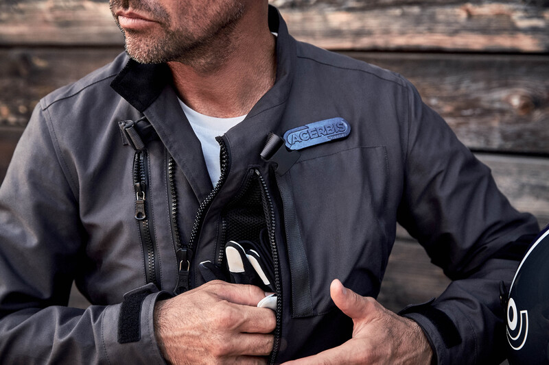Offerta in due colori (blu o grigio) ha taglie dalla S alla XXL. È realizzata in cotone e nylon resinato principalmente, il tessuto è made in Italy. Ha protezioni omologate di livello 1 e 2 su spalle, gomiti e schiena. Presenta pannelli in tessuto stretch sui gomiti e toppe di protezione. L’interno del collo è in velluto 2000 righe. La giacca ha 3 zip davanti con tenuta anti acqua. Due laterali hanno la funzione di presa d’aria, quella di sinistra presenta anche una comoda tascona in grado di contenere anche un iPad. Le tasche anteriori hanno la cerniera a prova d’acqua e la giacca nel suo complesso è antiacqua. Le zip sono fatte in Italia e coperte da brevetto. L’interno presenta l’imbottitura sfoferabile e trapuntata, fissata con bottoni. Il capo è personalizzato con la placca Acerbis, removibile. Sulla parte posteriore è presente la serie di nastri in nylon modulari utilizzati in ambito militare (il sistema si chiama MOLLE).