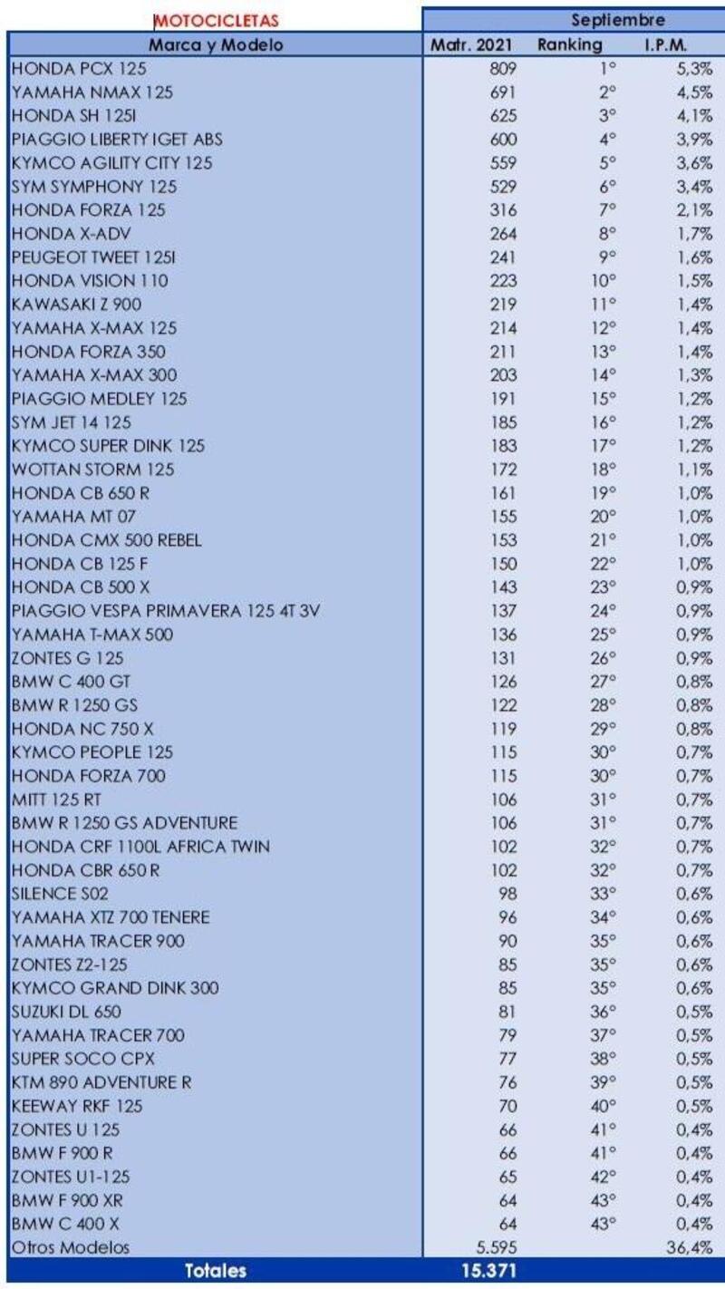Allargando l'orizzonte temporale ai primi nove mesi del 2021, il podio è formato da Honda PCX125 (4.787 unità e un +9,3% sul 2020), Yamaha NMAX 125 (4.625 e +26%) e Kymco Agility 125 (4.134 unità e -13% rispetto all'anno scorso).