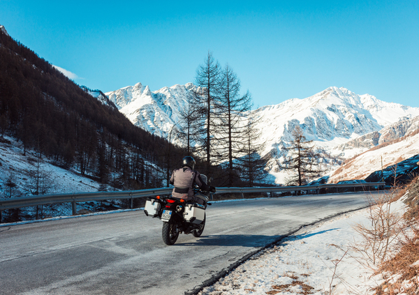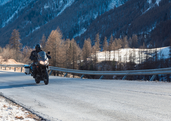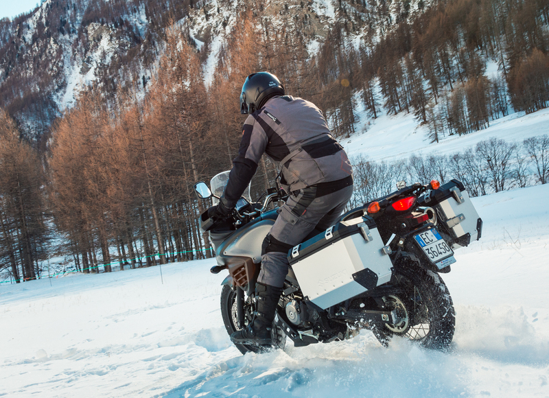 Durante il test sono stati proprio gli pneumatici Anlas specifici da neve colpirmi maggiormente, che con il loro battistrada lamellare di derivazione automobilistica, offrono una guida assolutamente confortevole sull’asfalto pulito, garantendo comunque un grip sufficiente a mantenere il controllo della moto anche su fondi innevati, soprattutto se battuti. A patto di percorrere una strada asciutta infatti, la sensazione di guida è sicura e composta. Anche forzando l’andatura il comportamento delle Anlas non cede mai al sottosterzo, come solitamente succede con le gomme tassellate. Addirittura il comportamento su asfalto umido è ottimo. La mescola morbida offre un’aderenza degna di nota su ogni tipo di fondo, drenando bene l’acqua e rassicurando il guidatore. Ma la prova non era sufficiente e mi sono voluto spingere oltre, deviando il percorso stabilito. Lasciando la strada ed imboccando un percorso innevato fresco ho provato un’impressione particolarmente positiva.