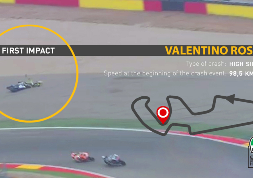 I sintomi riscontrati da Valentino, temporanea perdita di memoria e mal di testa, sono probabilmente da attribuire alla violenta e repentina accelerazione rotazionale del capo dovuta al contatto tra casco e pneumatico posteriore ancora in rotazione.