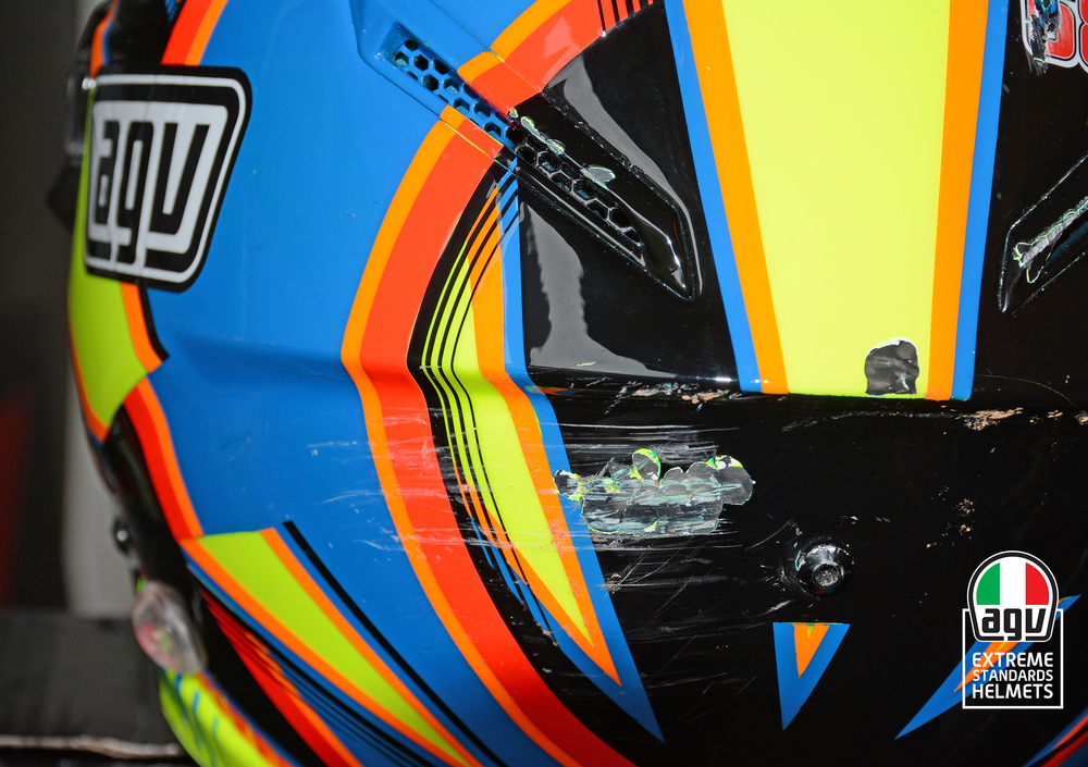 L’elevato attrito creatosi tra pneumatico e casco ha portato a staccare la parte destra della visiera dalla calotta, con la rottura del meccanismo, in metallo, di rotazione e fissaggio della stessa. Inoltre la visiera si è crepata anche sul lato opposto, sempre in prossimità del meccanismo di aggancio, senza però staccarsi dalla sua sede di ancoraggio. Tale protezione è stata anche garantita dal kit racing (vite supplementare in metallo di bloccaggio della visiera al meccanismo di rotazione) che AGV utilizza su tutti i caschi da competizione. Questo importante kit è offerto come accessorio anche per tutti i clienti e piloti privati.