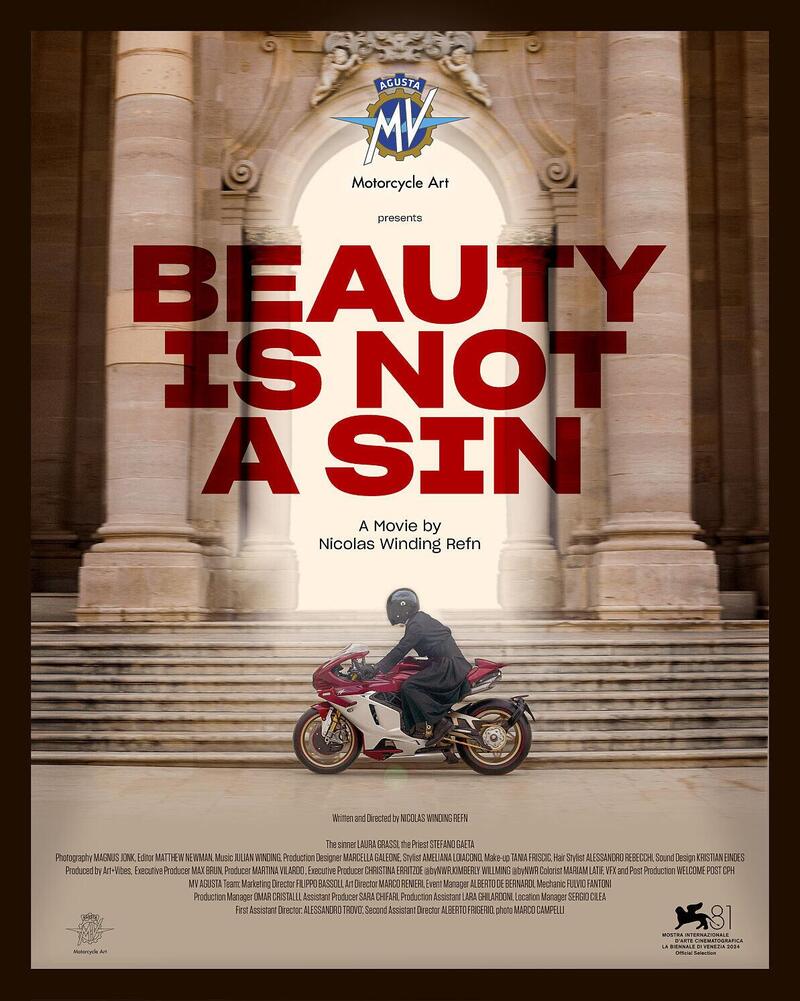 Scritto e diretto da Nicolas Winding Ref questo cortometraggio è stato presentato durante l’appena conclusa 81esima Mostra Internazionale d'Arte Cinematografica di Venezia, nella sezione ufficiale, quella più solenne ed autentica del Festival. Un aspetto non proprio scontato anzi… è bene sottolineare che è la prima volta che uno spot pubblicitario entra in questa sezione dove l’arte cinematografica è ai massimi livelli e quando Venezia si trasforma per qualche giorno nella capitale del cinema mondiale. MV, per realizzare “Beauty Is Not A Sin”, ha lasciato libertà assoluta al regista, il risultato è un corto di 7 minuti ricco di bellezza ed armonia attorno alla magnificenza estetica della nuova Superveloce 1000 Serie Oro. Alberto Barbera, direttore del festival di Venezia dichiara: “…è troppo bello per essere considerato solo uno spot pubblicitario”.