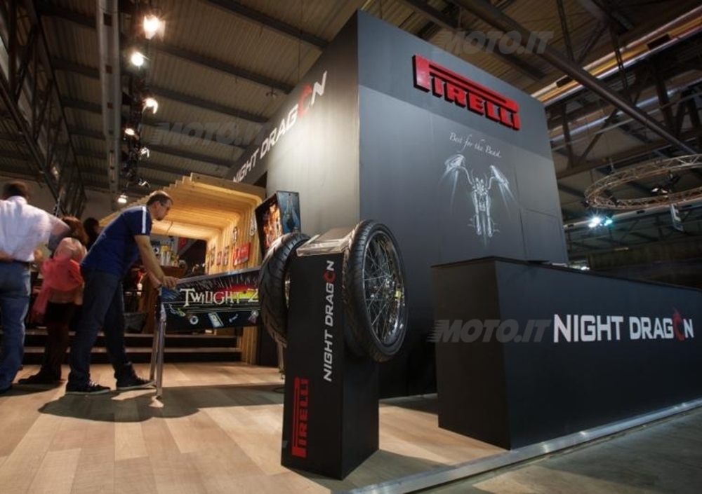 Lo stand è stato progettato da Pirelli come un punto di ritrovo e socializzazione in cui i visitatori potranno respirare le atmosfere del mondo custom: in esposizione troveranno anche un modello Harley Davidson Softail Slim con pneumatici Pirelli Night Dragon del concessionario Harley Davidson Bolzano. I Night Dragon sono la nuova generazione di pneumatici custom touring di Pirelli che è sempre più impegnata a sviluppare prodotti tecnologicamente all’avanguardia, non solo in ambito sportivo e racing ma anche in quello touring e custom. I Pirelli Night Dragon sono pneumatici dedicati ai motociclisti possessori di custom che, oltre alle doti di stabilità e lunga durata che sono un vero “must” per questo segmento, cercano anche la maneggevolezza e il grip tipici del DNA Pirelli.