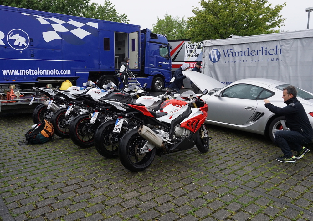 Emozione a 1000, tuta, casco, guanti e si sale sulla “Piranha”, una “tranquillissima” special da 190CV su base S1000RR messa a disposizione da Wunderlich. Davanti a noi Sebastian, anche lui veterano del Nürburgring, che con la sua S1000XR ci ha fatto da guida per entrambi i giorni. Nemmeno il secondo giorno il tempo è stato dalla nostra parte ma in ogni caso siamo riusciti comunque a girare la mattina, e ovviamente non ho perso l’occasione per provare anche l’S1000R e l’R1200. Beh che dire, per uno come me abituato alle piste “classiche” capisci subito che qui stiamo parlando di tutt’altro: vie di fuga inesistenti, erba al posto della ghiaia, guardrail, cordoli alti, saliscendi degni di un parco divertimenti e punti in cui la pista si fa talmente stretta che ti chiedi come facciano auto e moto a correre assieme! Il tutto nel bel mezzo di una magnifica foresta!