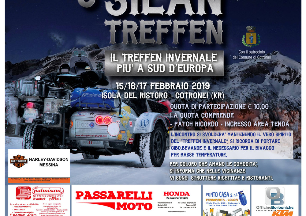 Dopo l'Agnellotreffen, seguito dal nostro Andrea Perfetti, ci spostiamo mille chilometri più a sud per un altro raduno in pieno stile invernale: dal 15 al 17 febbraio saremo al Silantreffen, il raduno che si svolge in Calabria, nel comune di Cotronei (Crotone) sull'altopiano della Sila a 1.278 metri d'altitudine. È il raduno invernale più a sud d'Europa: un treffen estremo (anche geograficamente) nato quasi per scherzo nel 2013 da due ragazzi con l'intento di fare una zingarata sulla neve e sulle rive ghiacciate del lago Ampollino: ma evidentemente la cosa poi deve esser sfuggita loro di mano, se nella sua ultima edizione ha richiamato oltre 800 motociclisti da tutta Italia.