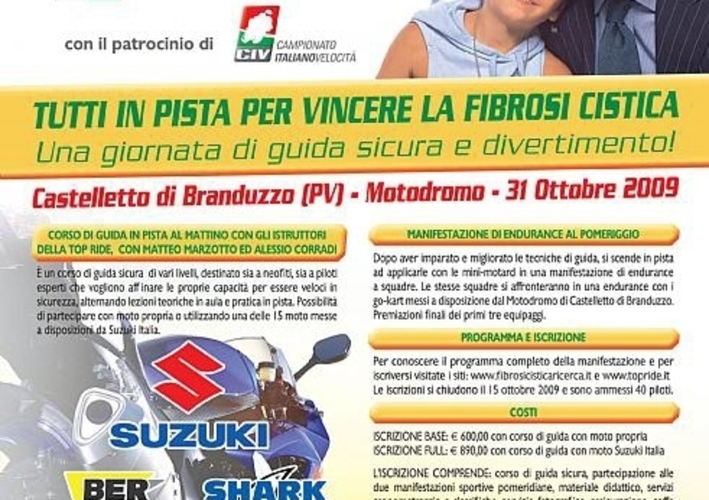 E ora si profila questa nuova importante avventura solidale, che coinvolgerà direttamente il pubblico, organizzata dalla Fondazione per la Ricerca sulla Fibrosi Cistica, della quale Matteo Marzotto è co-fondatore, Vicepresidente e testimonial, con la collaborazione di Top Ride, Suzuki, BER Racing Italy e del Motodromo pavese di Castelletto di Branduzzo.