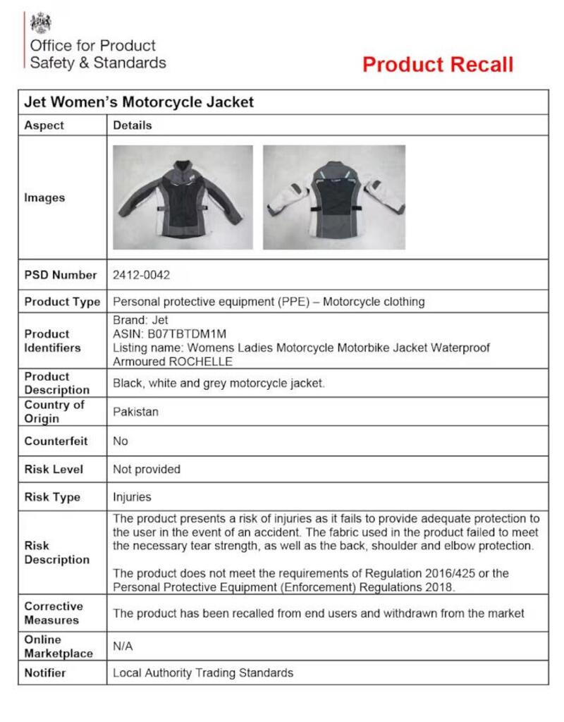 Tessuti non resistenti all'abrasione, protezioni inefficaci, che costringono il colosso della vendita online non solo a bandire l'acquisto del capo non idoneo, ma altresì a contattare ogni singolo cliente e provvedere al rimborso completo dell'mporto speso.