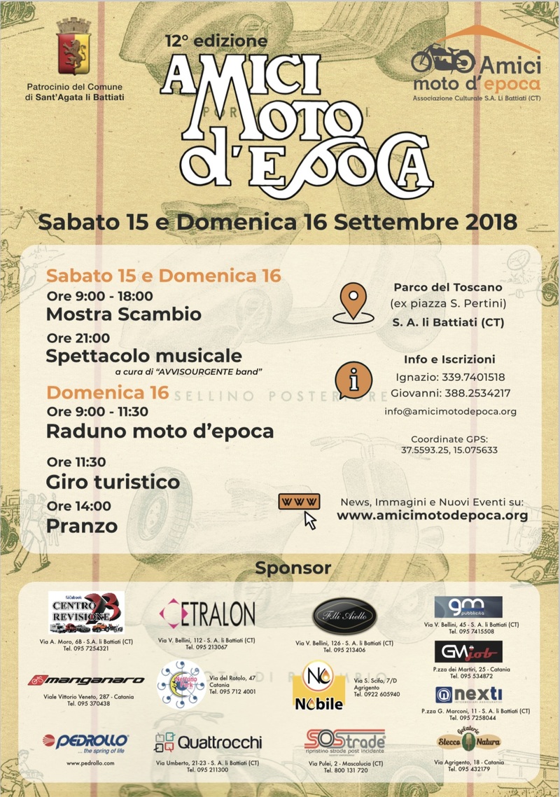 Questo fine settimana, a Sant'Agata li Battiati, il centro a pochi minuti da Catania di cui si dice sia il “salotto buono”, si terrà la dodicesima edizione del raduno Amici Moto d'Epoca: l'evento comprende una mostra-scambio, una domenica in compagnia di molte bellezze a due ruote rigorosamente d'epoca, e un tour per far macinare un po' di strada alle vecchie glorie a motore.