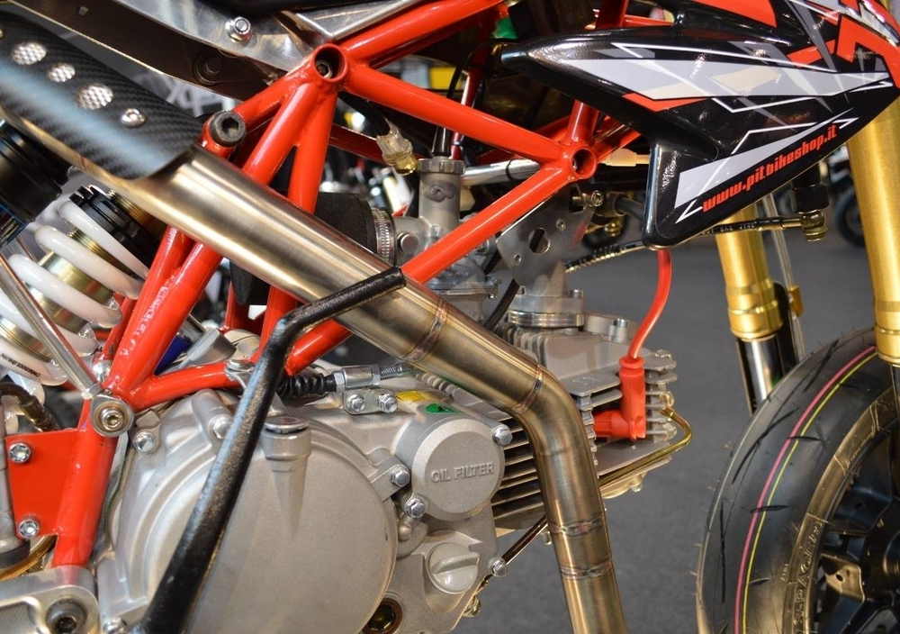 La moto, grazie alle forniture della Pit Bike Shop, viene poi completata da un motore monocilindrico quattro tempi raffreddato ad aria, generalmente di 150 cc e una potenza di 12cv alla ruota, preventivamente smontato per perfezionare gli scorrimenti interni, le accortezze di assemblaggio e la potenza in base alle fiches di regolamento. L’impianto frenante prevede una disco da 230 mm per l’anteriore e uno da 190 mm per il posteriore in versione originale, con pinza a doppio pistonicino contrapposto comandata da una pompa freno da 11 mm in versione da competizione. Cerchi a 5 razze da 12 pollici con canale da 2,5 all’anteriore e 3 al posteriore, forcella a steli rovesciati e mono ammortizzatore posteriore pluri-regolabili completano il piccolo bolide.