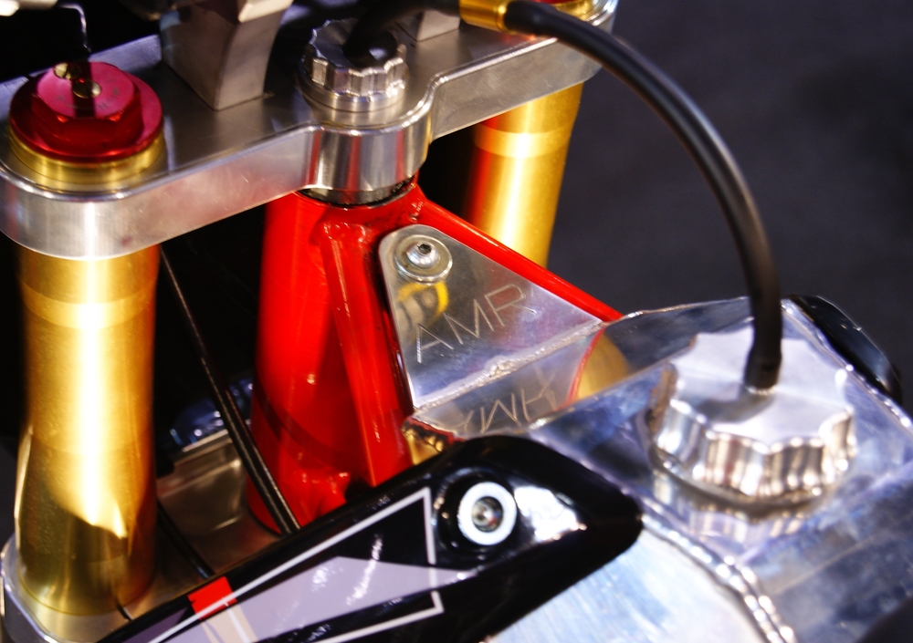 AMR anche la costruzione del forcellone in ergal, delle piastre sterzo ricavati dal pieno e del serbatoio di alluminio. Alcuni accessori come il tappo benzina, i perni ruota, il tappo del cannotto vengono realizzate con fresatrici a controllo numerico, talmente curati nei particolari che difficilmente si può credere che provengano da un anonimo blocco di lega metallica.