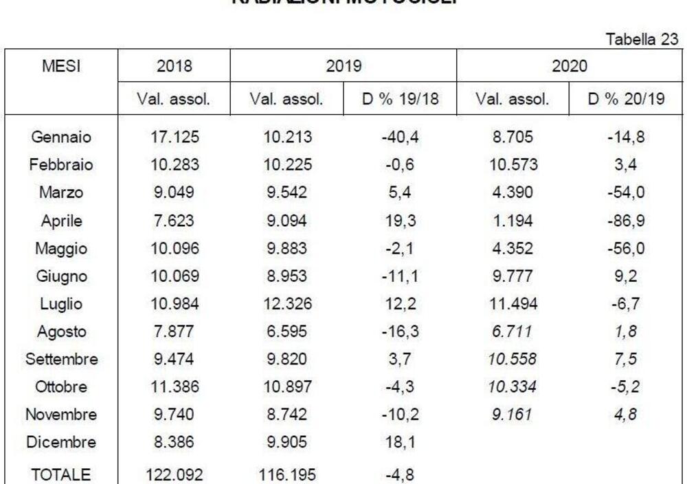 Passando alle radiazioni moto e scooter, a novembre sono state 9.161: +4,8% sullo stesso mese del 2019 quando si registrò un -10,2%. Da gennaio a novembre le radiazioni totali sono state 84.251, ovvero -20,7%.