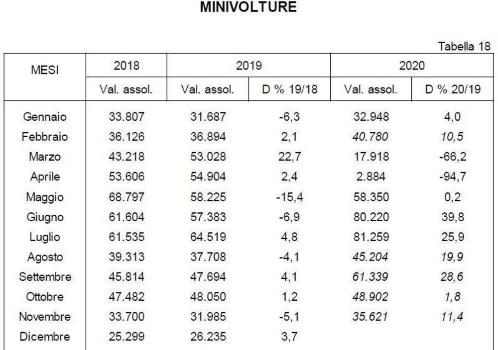 Sempre a novembre i passaggi di proprietà al netto delle minivolture (cioè i trasferimenti temporanei a nome del concessionario in attesa della rivendita al cliente finale e che in questo mese hanno pesato per il 15% del totale) sono stati 35.621, in aumento dell'11,4% su novembre 2019 che, da parte sua, aveva sofferto un -5,1% se rapportato all'annata precedente.