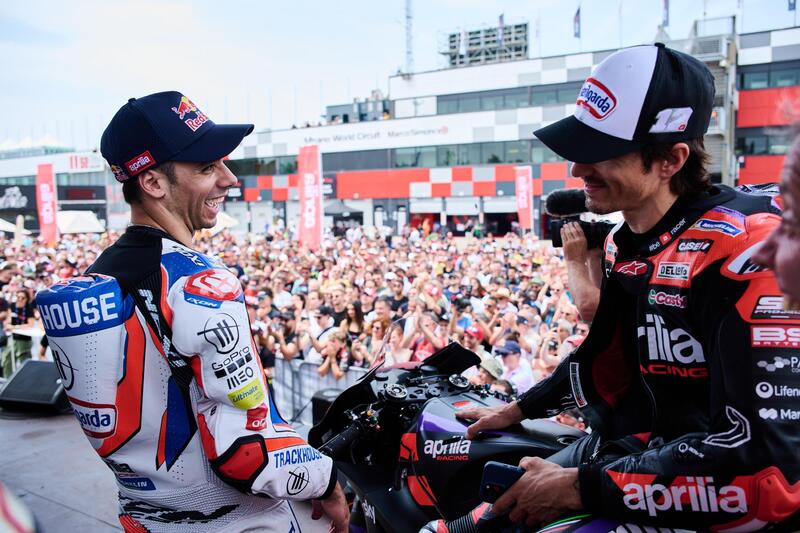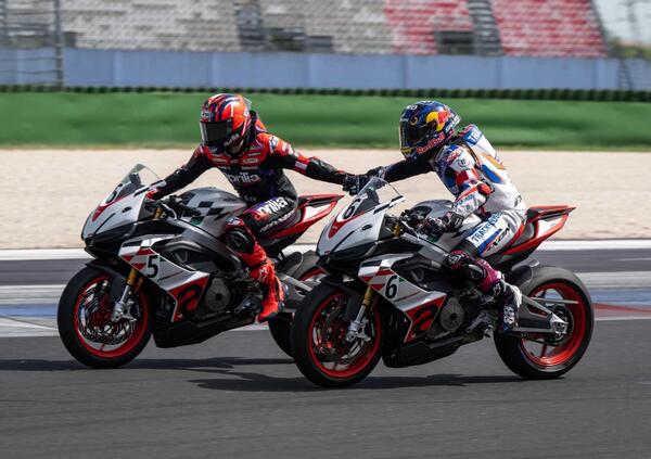 I piloti si sono divertiti come ragazzini scatenati, riportando in pista le 125 e le 250 dominatrici delle classi 2T del Motomondiale, per poi essere protagonisti della Race of Stars, spettacolare gara a coppie e con partenza in stile Le Mans che li ha visti battagliare in pista in sella alle Aprilia RS 660. Alla fine di undici divertentissimi giri, pieni di colpi di scena e dopo due cambi pilota, ha vinto la coppia formata da Miguel Oliveira e Loris Capirossi che si è imposta davanti a Maverick Viñales e al giornalista/tester e collega Stefano Cordara. Ad Aleix Espargaró e Matteo Baiocco è andato l’altro posto sul podio.
