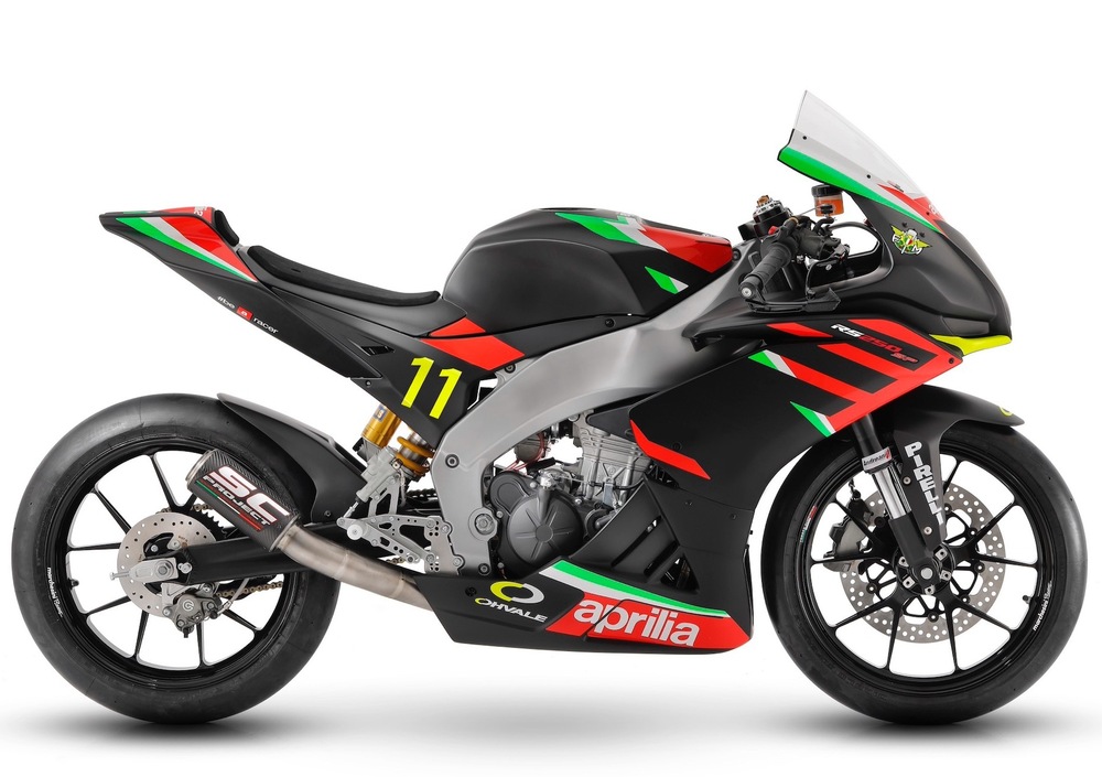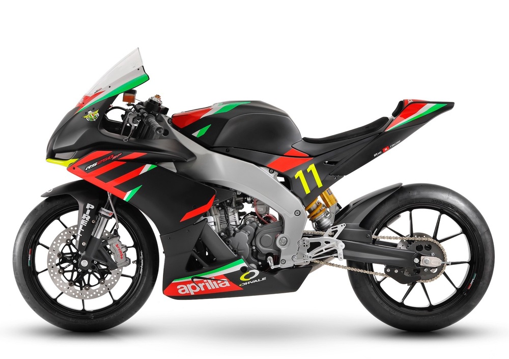 Sviluppata in collaborazione fra il Reparto Corse Aprilia di Noale e Ohvale, la RS 250 viene sostanziosamente alleggerita - 35 kg meno della RS 125 stradale - e monta componentistica di primissimo piano (Brembo, Öhlins, SC Project) oltre a cerchi Marchesini da 17" gommati Pirelli.