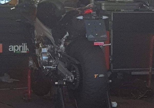 La presenza di una versione gara (della cui esistenza siamo sicuri per altre vie) verrebbe confermata dalla seconda foto, quella in pitlane, priva di orpelli stradali anche se, a dire la verità, su questa abbiamo qualche dubbio in più visto l'andamento del telaio che sembra invece proprio quello della RSV4 attuale, quindi potrebbe trattarsi di un ibrido o magari di uno sviluppo ulteriore sulla nuova RSV4 1100.
