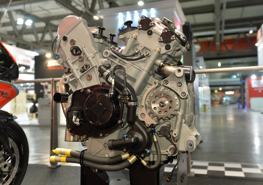 Motore di serie alleggerito, senza termostato e circuito aria secondario, con circuito tubi di raffreddamento semplificato. Kit scarico Akrapovic, kit carenatura e ottimizzazione completa del motore.