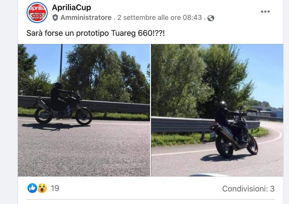 E' lei o non è lei? Certo che è lei! Così direbbe Ezio Greggio e così esclamiamo anche noi davanti alle foto della probabile Aprilia Tuareg 660, pubblicate dalla pagina Facebook Aprilia 660 world group, che difficilmente scambia una Aprilia per un'altra moto.