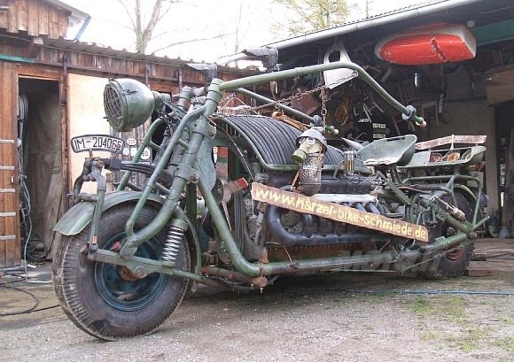 La Harzer Bike Company (questo il nome di chi ha ordito il mirabolante oggetto) non si è risparmiata, donando una livrea verde militare al mezzo. Le ruote ricordano quelle di un camion, ma assicurano un grip da Motogp, mentre il telaio è stato progettato da tecnici della Superbike in cerca di ingaggio.