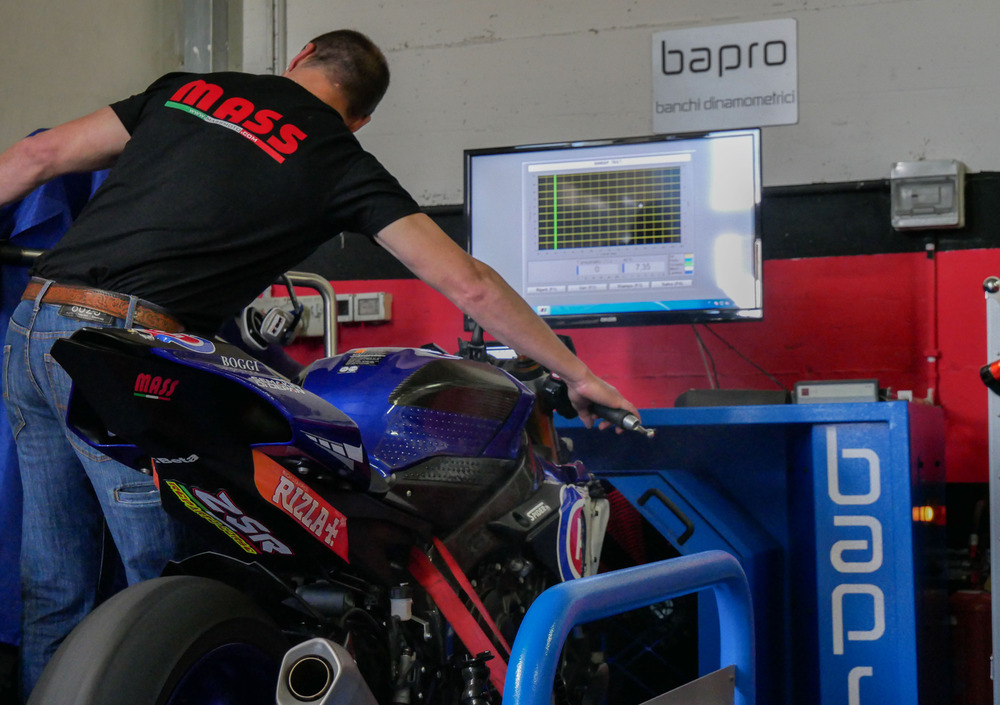 Ringraziamo ancora Antonio per questo rapido test che potrebbe avere presto un'interessante appendice (stay tuned...) e passiamo ad un altro argomento. L'urlo virile delle moto di Antonio era quello che proveniva dagli scarichi della Mass, la sua azienda, e tra un turno e l'altro raccolgo l'invito dei fratelli Saitta a vedere con mano la differenza tra uno scarico originale e uno aftermarket progettato e costruito da loro, con prova al banco. È una sfida?