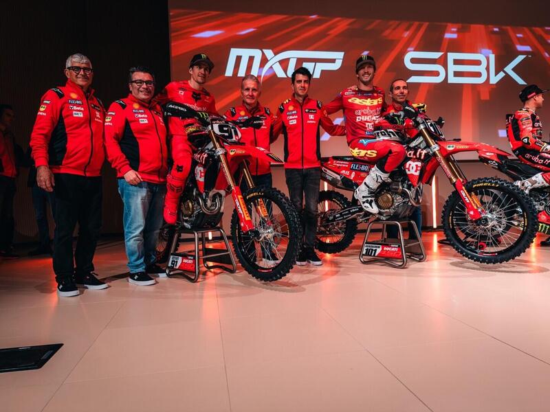 È sempre interessante salutare le ambizioni di quelli bravi, quale che sia la loro specializzazione, ma è chiaro che eravamo lì per accogliere il battesimo formale dell’ingresso di Ducati Racing nel Campionato del Mondo MXGP. E quella è un’altra famiglia nella famiglia, ci pare di poterlo dire con una certa sicurezza. Una famiglia i cui tutti sono appassionati. Altrimenti non sarebbero della famiglia. Ecco dunque l’intro dell’Aruba.it - Ducati Factory MX Team. Un’evoluzione della relazione, dell’associazione tra due Marchi dell’eccellenza, ripeto, guarda caso, italiana. È la presentazione ufficiale delle nuove Desmo450 MX con cui Jeremy Seewer e Mattia Guadagnini parteciperanno al Campionato Mondiale Motocross 2025, prima stagione iridata MXGP per la Casa Borgo Panigale. Lo svizzero è l’esperienza e l’ambizione di un trentenne cui brillano gli occhi di un bambino di fronte a una nuova sfida, per l’Italiano è l’occasione di una svolta epocale della carriera e dell’esperienza della vita, da atleta e agonista, s’intende. Ci si arriva in un punto della parabola Ducati che pone il suo punto di inizio nel 2001, che nel 2023 ha fatto vedere la Moto, e che alla fine del 2024 ha vinto il suo primo Titolo, l’Italiano Prestige MX1 2024 al debutto con Alessandro Lupino.