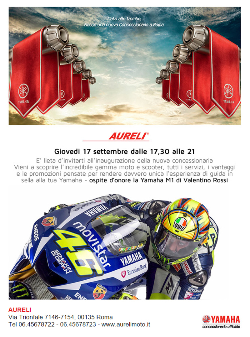 Giovedì 17 settembre, in via Trionfale 7146-7154 a Roma, Aureli inaugura la nuova concessionaria Yamaha. L'appuntamento da mettere in agenda è dalle ore 17.30 alle ore 21.00, ospite d'onore sarà la Yamaha M1 numero 46, quella di Valentino Rossi.