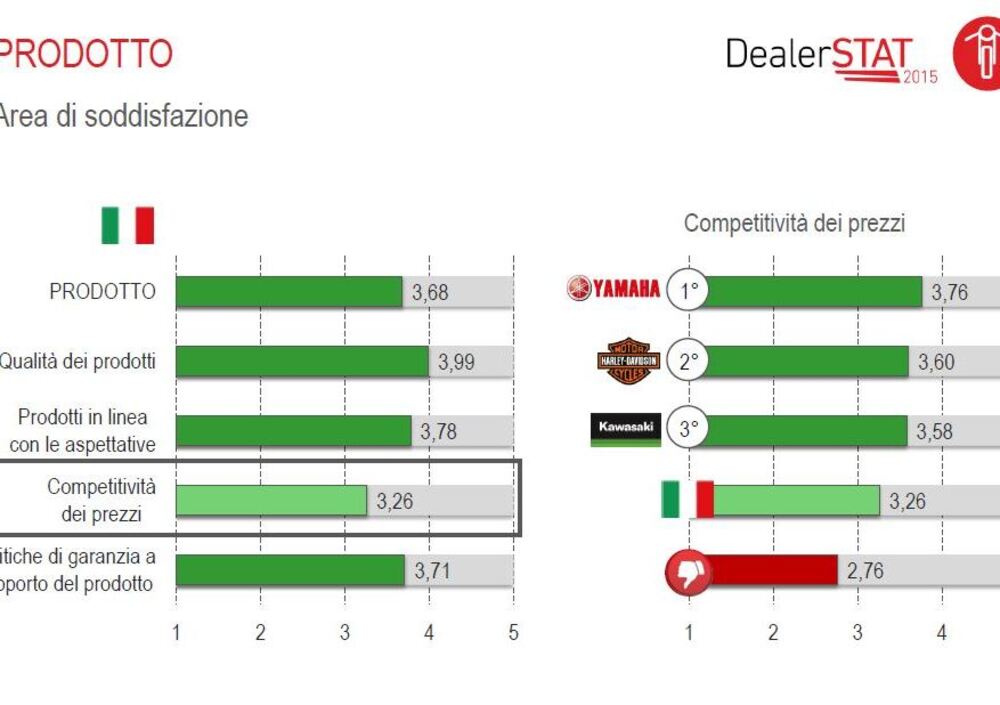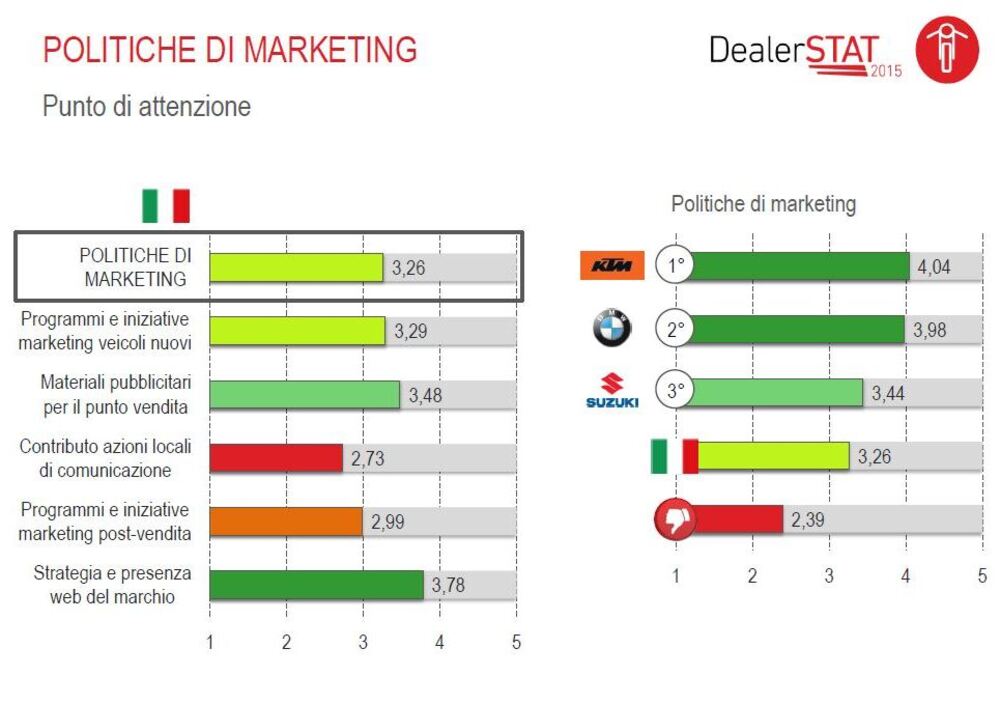 Per quando riguarda la competitività dei prezzi, i concessionari interessati giudicano con il voto migliore Yamaha, seguita da Harley-Davidson e Kawasaki. Le politiche di marketing, con una valutazione complessiva che supera appena la sufficienza, vedono al primo posto KTM, seguita da BMW e Suzuki.