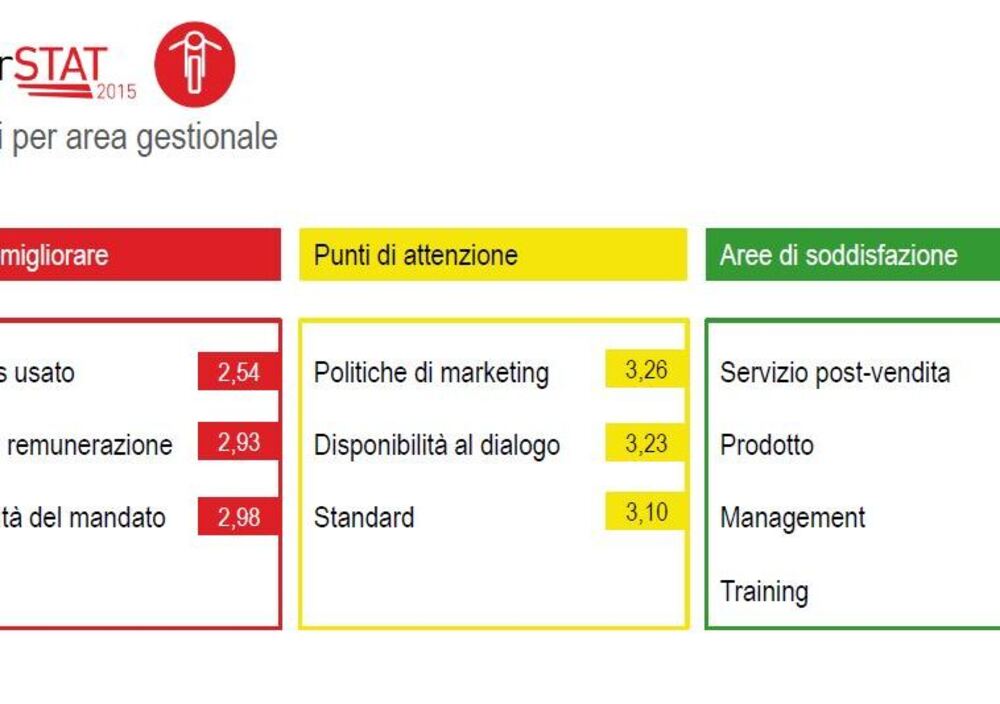 La valutazione complessiva esprime soddisfazione e in particolare sono positivi i giudizi che riguardano (nell'ordine di rilevanza): servizio post vendita (trasporto e consegna ricambi al primo posto, flessibilità garanzie all'ultimo), prodotto venduto, management e training. Le aree che meritano attenzione sono invece le politiche di marketing, la disponibilità al dialogo e lo standard, mentre sono giudicate aree da migliorare il business dell'usato, le politiche di remunerazione e la redditività del mandato.